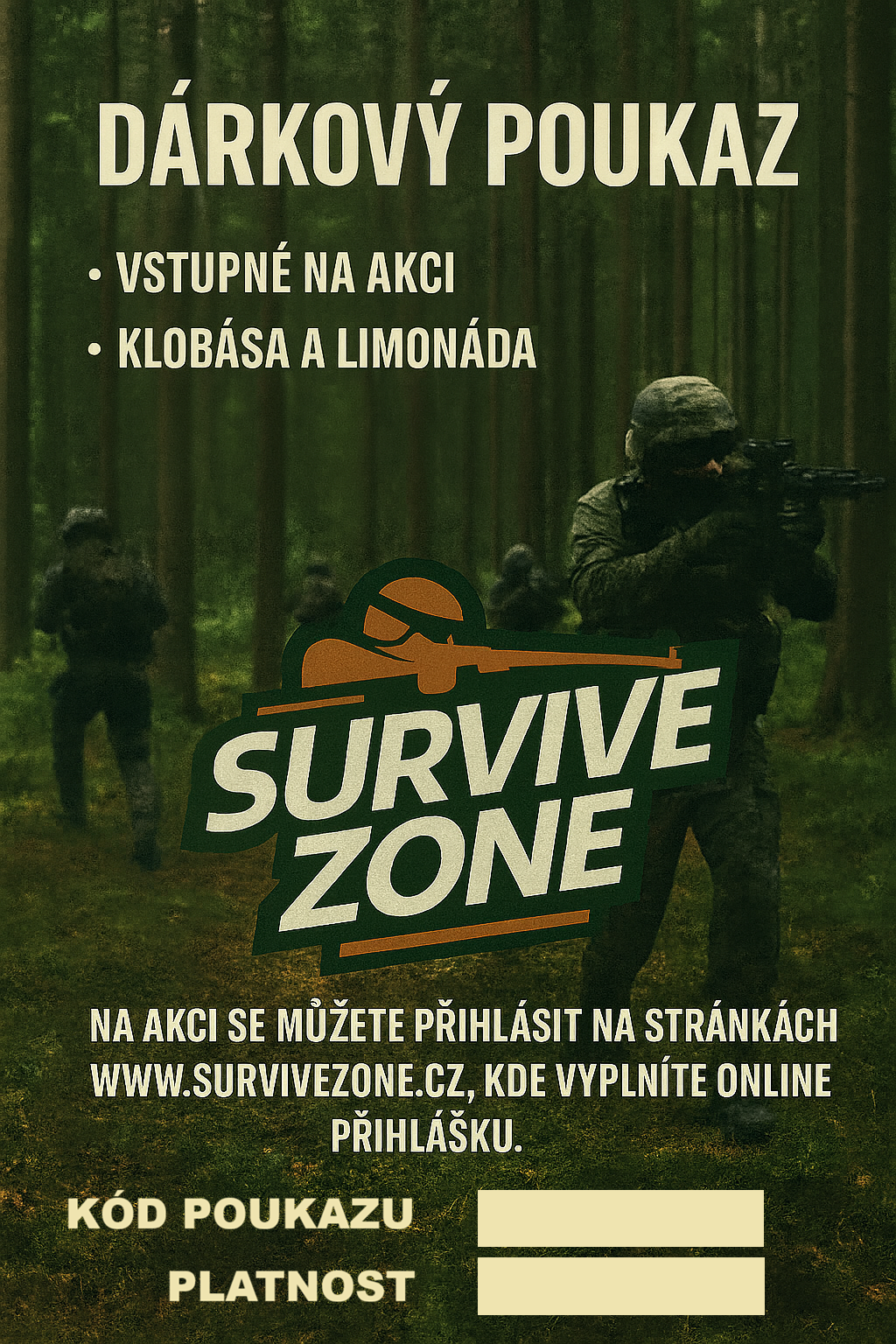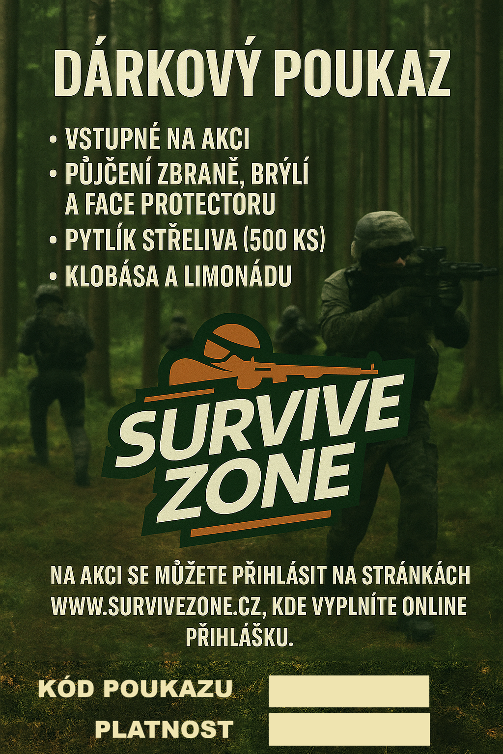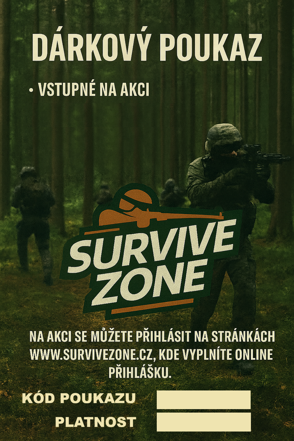 Dárkové poukazy na airsoftové akce pořádané v Survive Zone. Ocení všichni airsofťáci, kteří pravidelně navštěvují naše akce nebo by chtěli akci u nás zkusit. Lze použít pouze na běžné akce, kde je vstupné 300,- Kč. Pokud budete chtít použít poukaz na jinou mimořádnou akci s vyšším vstupným, je třeba doplatit rozdíl. Poukazy mají platnost 1 rok.